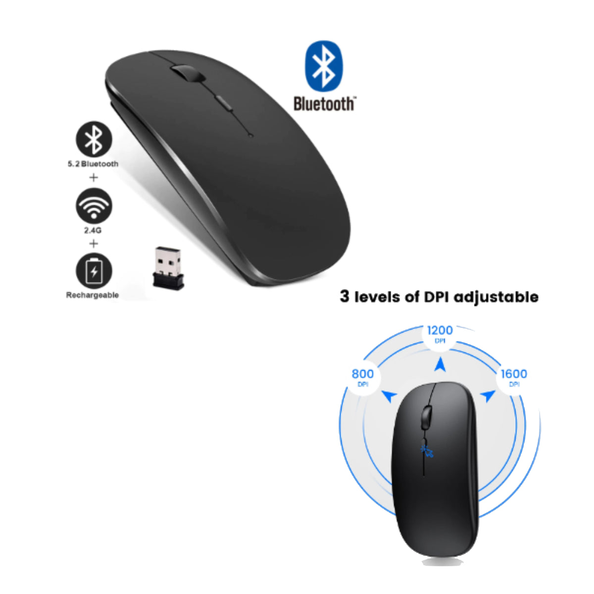 Mouse inalámbrico recargable con doble modo de conexión (USB 2.4G + Bluetooth), diseño ergonómico y silencioso. Ideal para oficina, estudio y uso diario. Compatible con notebooks, PCs y tablets.